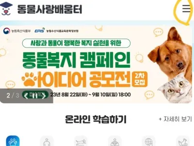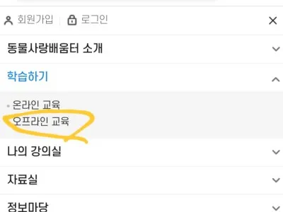 동물 사랑 배움터에 회원가입 후 학습하기 탭에서 오프라인 교육을 클릭하고, 교육 지역을 전라북도로 선택하면 빠르게 수강신청을 할 수 있어요. 또 카카오톡 플러스 친구 [동물 사랑 배움터 신청] 채널 추가 후 접수할 수도 있습니다.