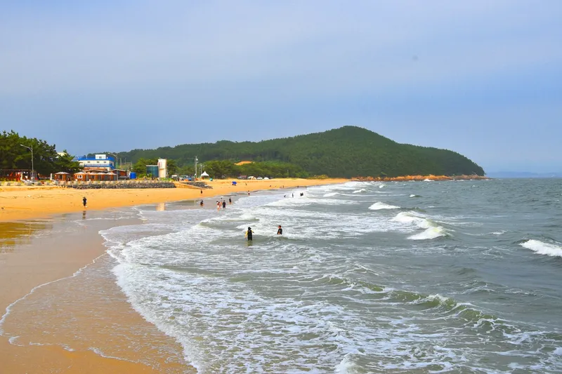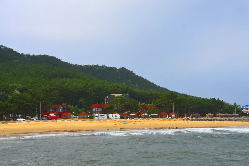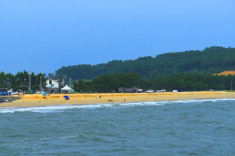 해수욕장 백사장을 따라 소나무 숲이 우거져 아늑한 분위기를 자아냅니다.