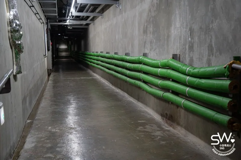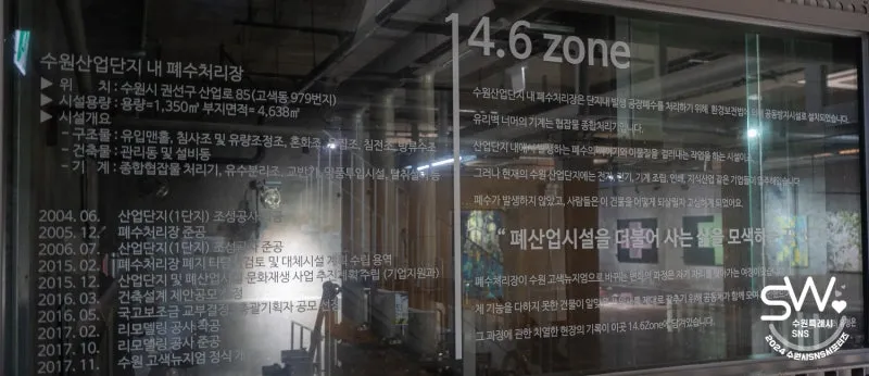 벽면에는 고색뉴지엄 변천사가 담겨져 있습니다. 고색 뉴지엄은 원래 폐수처리장 목적으로 만들어졌다고 합니다. 산업단지 조성 초기인 2005년 준공되었지만 첨단기업(전기, 전자, IT 등)들이 산업단지에 입주하면서 폐수처리장은 쓸모가 없어졌고, 존재가 희미해진 채 10여년간 버려진 공간이 되었습니다.
