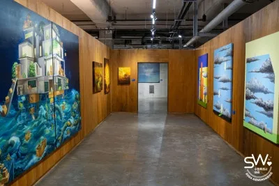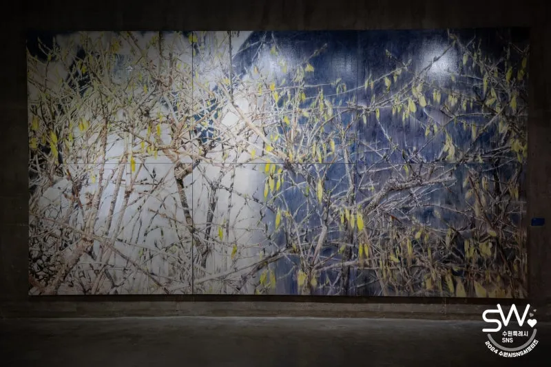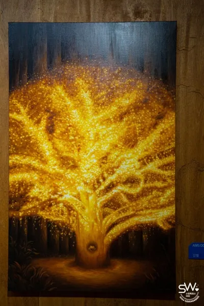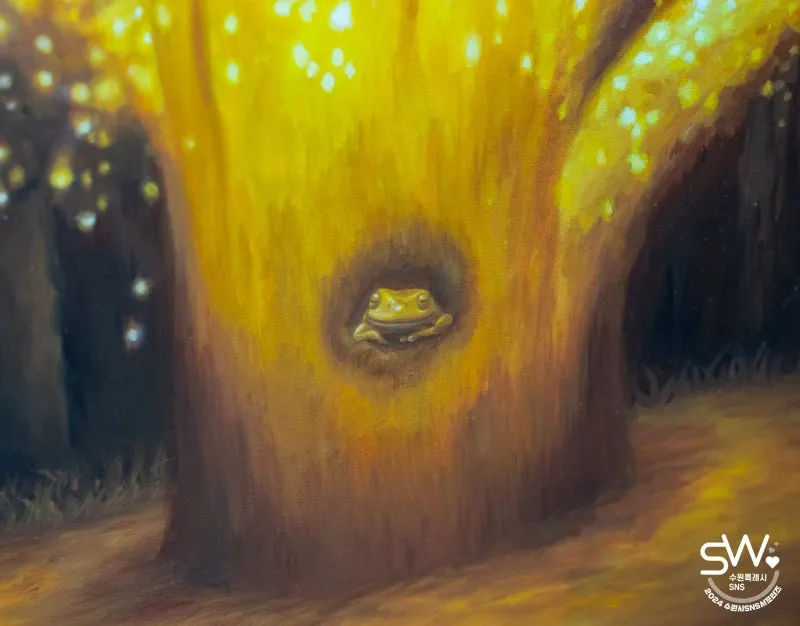 하나의 생태계를 이루고 있는 개구리도 볼 수 있었습니다. 벽면을 가득 채우고 있는 스케일에 압도되는 듯 합니다. 황금빛으로 빛나는 나무 그리고 나무 기둥 속에 개구리 한 마리가 인상적인데요. 작가가 어떤 의도로 그렸을지 생각하게 됩니다.