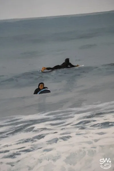 넓은 바다, 출렁이는 파도 속 서핑하는 두 사람들의 모습도 보이고,