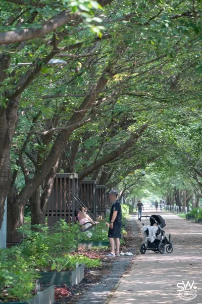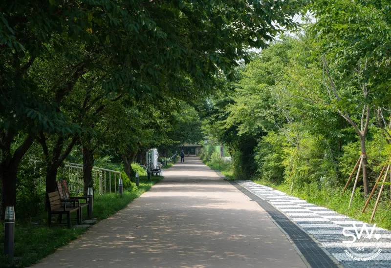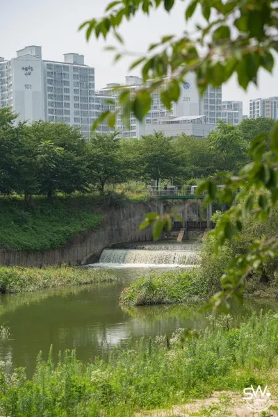 뉴지엄 바깥으로 나와보면 맞은편에는 오목천 공원이 있고 안쪽에는 황구지천이 바로 보입니다. 한적하면서 넓은 도로로 자전거 타기에도 좋은 곳입니다.