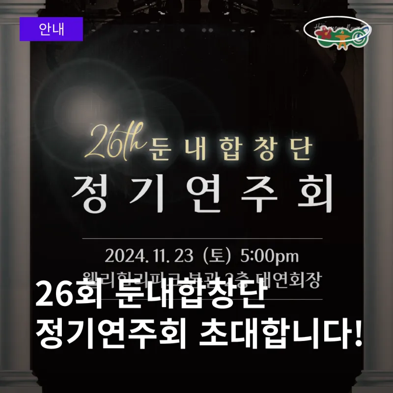 안녕하세요! 둔내합창단이 오는 11월 23일(토), 제26회 정기 연주회로 여러분을 찾아갑니다.