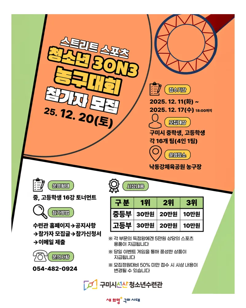 구미시선산청소년수련관 청소년 3on3 농구대회 ‘스트리트 스포츠’ 참가자 모집⛹️