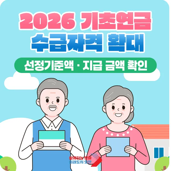 기초연금은 만 65세 이상 어르신 중 소득 및 재산이 일정 기준 이하인 분들에게 매월 연금을 지급하는 제도죠. 안정적인 소득 기반을 제공함으로써 고령층의 빈곤 완화와 삶의 질 향상을 돕고 있는데요. 새해를 맞아 기초연금 수급자격이 완화되고, 지급 금액이 늘어나 더 많은 어르신들이 혜택을 받을 수 있을 전망입니다. 달라진 2026 기초연금 제도에 대해 오산시와 함께 알아보아요!