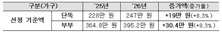 단독가구 월 247만 원 이하, 부부가구 월 395만 원 이하로 인상