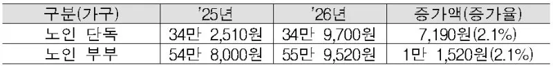 2026년 기초연금 금액은 노인 단독 가구 기준 월 최대 34만 9,700원으로 지난해보다 7,190원(2.1%) 인상되었고요. 부부가구 기준으로는 월 최대 55만 9,520원으로 작년보다 1만 1520원(2.1%)이 더 늘어납니다.