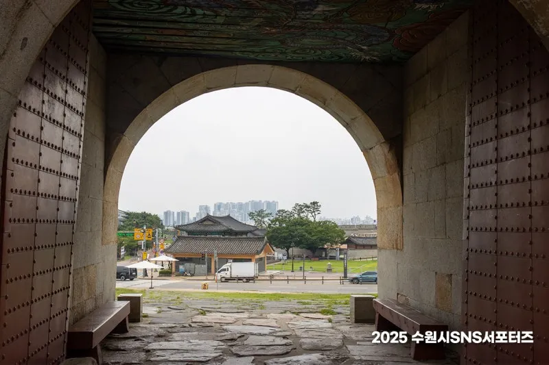 군사 훈련을 지휘하던 곳 ‘연무대’라고 불리는 곳에서 걷기 시작한 창룡문이 저만치 보이는데요. 마당 한가운데 장수가 말을 타고 오를 수 있도록 경사로가 만들어져 있어, 방문하여 확인해 보는 것도 좋지 싶습니다. 개방 시간에 신발 벗고 올라갈 수 있는 곳에 올라 시원한 바람을 마주해 보는 것도 수원화성 여행 팁인 것 같습니다.