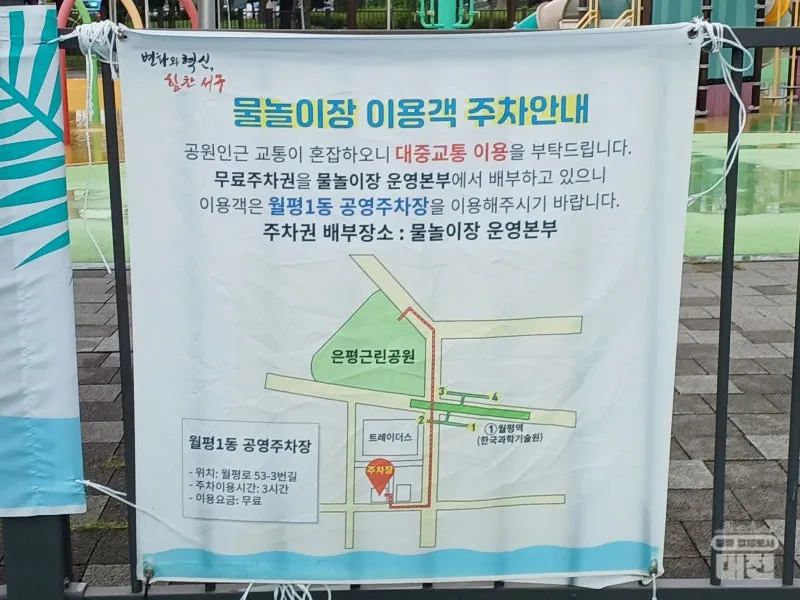 편의시설로 화장실, 탈의실이 있습니다. 주의사항으로는 수영복 및 물놀이용 신발을 착용해야 하고, 실내화 및 크록스는 안전상의 이유로 입장이 불가합니다. 음식물은 생수를 제외하고는 반입금지니까 방문 전 참고하시기를 바랍니다. 은평근린공원까지 자차로 방문하시는 분들은 무료 주차권을 물놀이장 운영본부에서 배부하고 있으니까 월평1동 공영주차장에 주차하신 후, 운영본부에서 무료 주차권까지 꼭 챙겨가세요.