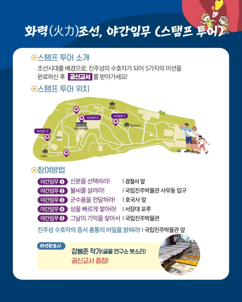 ✅화력(火力) 조선, 야간 임무 : 스탬프 투어 ➰방법 ① 신분을 선택하라! | 경절사 앞 ② 불씨를 살려라! | 국립진주박물관 사무동 입구 ③ 군수품을 전달하라! | 호국사 앞 ④ 성을 빠르게 쌓아라! | 서장대 포루 ⑤ 그날의 기억을 찾아서 | 국립진주박물관 ⑥ 진주성 수호자의 증서 총통의 비밀을 밝혀라! | 국립진주박물관 앞 ➰경품: 강봉준 작가(글꼴 연구소 붓소리) 공신교서 증정! |