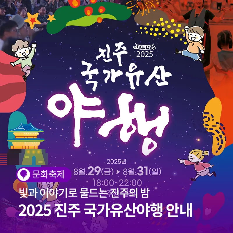 🌙 2025 진주 국가유산 야행 「화력(火力)조선, 진주성 총통의 기억」 ➰기간: 8. 29.(금) ~ 8. 31.(일) 18:00~22:00 / 3일간 ➰장소: 진주성 및 국립진주박물관 일원 ➰행사내용: 진주성을 배경으로 구성된 8야(夜)의 야행공간을 체험하는 이색 국가유산 야간 탐방 프로그램 ➰프로그램 ① 야경(夜景) ② 야로(夜路) ③ 야사(夜史) ④ 야화(夜畵) ⑤ 야설(夜設) ⑥ 야식(夜食) ⑦ 야시(夜市) ⑧ 야숙(野宿) |