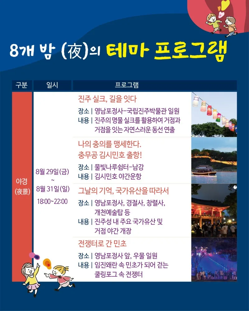✨야경(夜景) – 빛으로 물드는 진주성 ✅일시: 8. 29.(금) ~ 8. 31.(일) 18:00 ~ 22:00 ✅프로그램 ➰진주 실크, 길을 잇다 〰️장소: 영남포정사 - 국립진주박물관 일원 〰️내용: 진주 실크등(燈)을 활용하여 행사 동선 안내 ➰나의 충의를 맹세한다, 충무공 김시민호 출항! 〰️장소: 물빛나루쉼터 - 남강 〰️내용: 남강에서 진주성을 바라볼 수 있는 유람선 운항을 통해 진주성, 촉석루 등의 야경 관람 및 문화관광해설 ➰그날의 기억, 국가유산을 따라서 〰️장소: 진주성 주요 유형유산 〰️내용: 영남포정사, 경절사, 창열사, 개천예술탑 등 진주성 내 주요 국가유산 및 거점에 라이트 조명을 설치하여 라이트 아트 연출 ➰전쟁터로 간 민초 〰️장소: 영남포정사 앞, 우물 일원 〰️내용: 폭염대비 쿨링 포그와 조명 그리고 음향을 활용하여, 마치 전쟁터에 있는 듯한 분위기 연출 |
