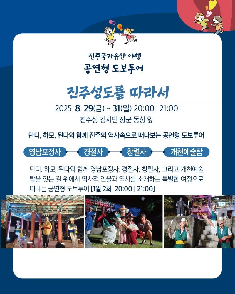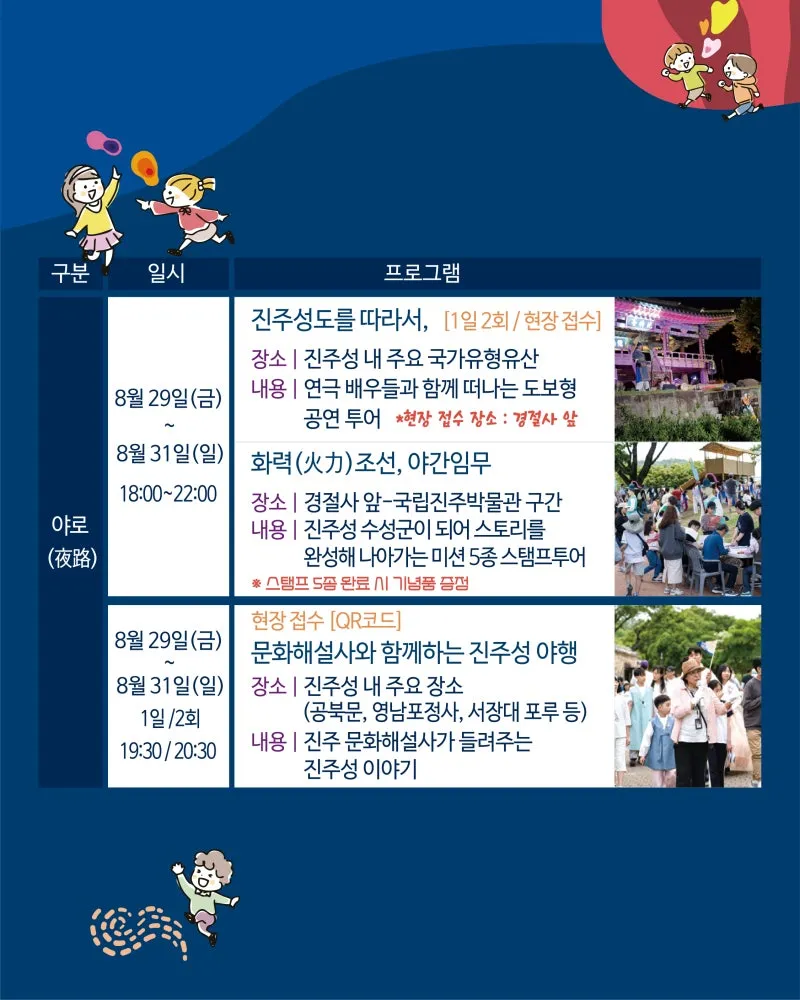 ✨야로(夜路) – 걸으며 배우는 역사 탐방 ✅일시: 8. 29.(금) ~ 8. 31.(일) 18:00 ~ 22:00 ✅프로그램 ➰진주성도를 따라서 〰️장소: 영남포정사, 북장대, 창렬사, 서장대 〰️내용: 진주성 내 주요 국가유형유산을 방문하여 진주의 역사적 인물과 역사를 소개하고 진주성 구석구석을 방문할 수 있는 교육형 투어 콘텐츠 〰️접수방법: 현장 접수(경절사 앞) ➰화력(火力)조선, 야간임무 〰️장소: 영남포정사 - 국립진주박물관 구간 〰️내용: 진주성 내 주요 유형유산에 미션 5종과 스탬프를 비치하여, 방문객이 진주성 구석구석을 관람하고 기념품을 받는 스탬프 투어 ✅일시: 8. 29.(금) ~ 8. 31.(일) 19:30 / 20:30 (1일 2회) ✅프로그램 ➰문화해설사와 함께하는 진주성 야행 〰️장소: 진주성 내 주요 장소(공북문, 영남포정사, 서장대 포루 등) 〰️내용: 진주 문화해설사가 들려주는 진주성 이야기 |
