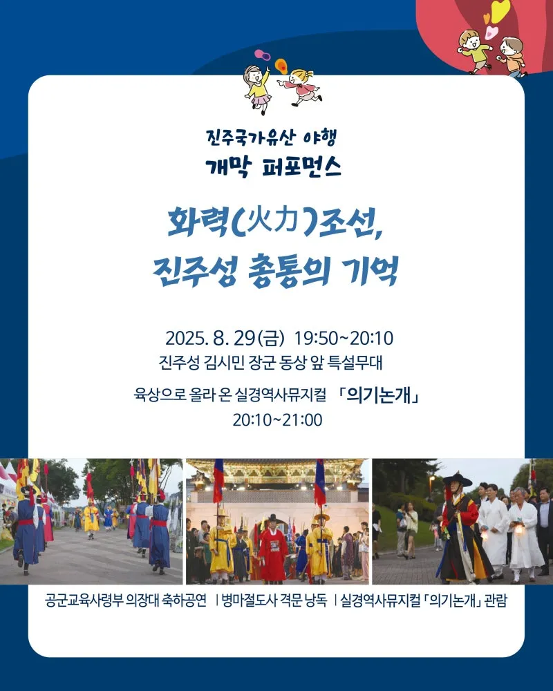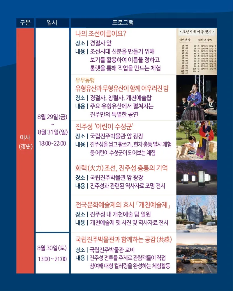✨야사(夜史) – 조선의 이야기 속으로 ✅일시: 8. 29.(금) ~ 8. 31.(일) 18:00 ~ 22:00 ✅프로그램 ➰나의 조선이름이요? 〰️장소: 경절사 앞 〰️내용: 조선시대 이름을 정하고 룰렛을 돌려 직업 만들기 체험 ➰유무동행-유형유산과 무형유산이 함께 어우러진 밤 〰️장소: 진주성 내 국가유형무산 〰️내용: 주성 내 주요 유형유산에서 펼쳐지는 진주만의 특별한 공연 ➰진주성 '어린이 수성군' 〰️장소: 국립진주박물관 일원 〰️내용: 활쏘기, 현자총통 발사 체험 등 어린이들이 수성군이 되어보는 체험 ➰화력(火力)조선, 진주성 총통의 기억 〰️장소: 국립진주박물관 〰️내용: 화력조선 체험 프로그램 운영, 조선 총통 전시 관람 등 ➰화력(火力)조선, 진주성 총통의 기억 〰️장소: 국립진주박물관 〰️내용: 화력조선 체험 프로그램 운영, 조선 총통 전시 관람 등 ➰전국문화예술제의 효시「개천예술제」 〰️장소: 진주성 내 개천예술 탑 〰️내용: 개천예술제 창시자 관련 전시, 개천예술제 의미 등 프로그램 구성 ➰국립진주박물관과 함께하는 공감(공감) 〰️장소: 국립진주발문관 로비 〰️내용: 진주성 전투를 주제로 관람객들이 직접 참여해 대형 컬러링을 완성하는 체험활동 |
