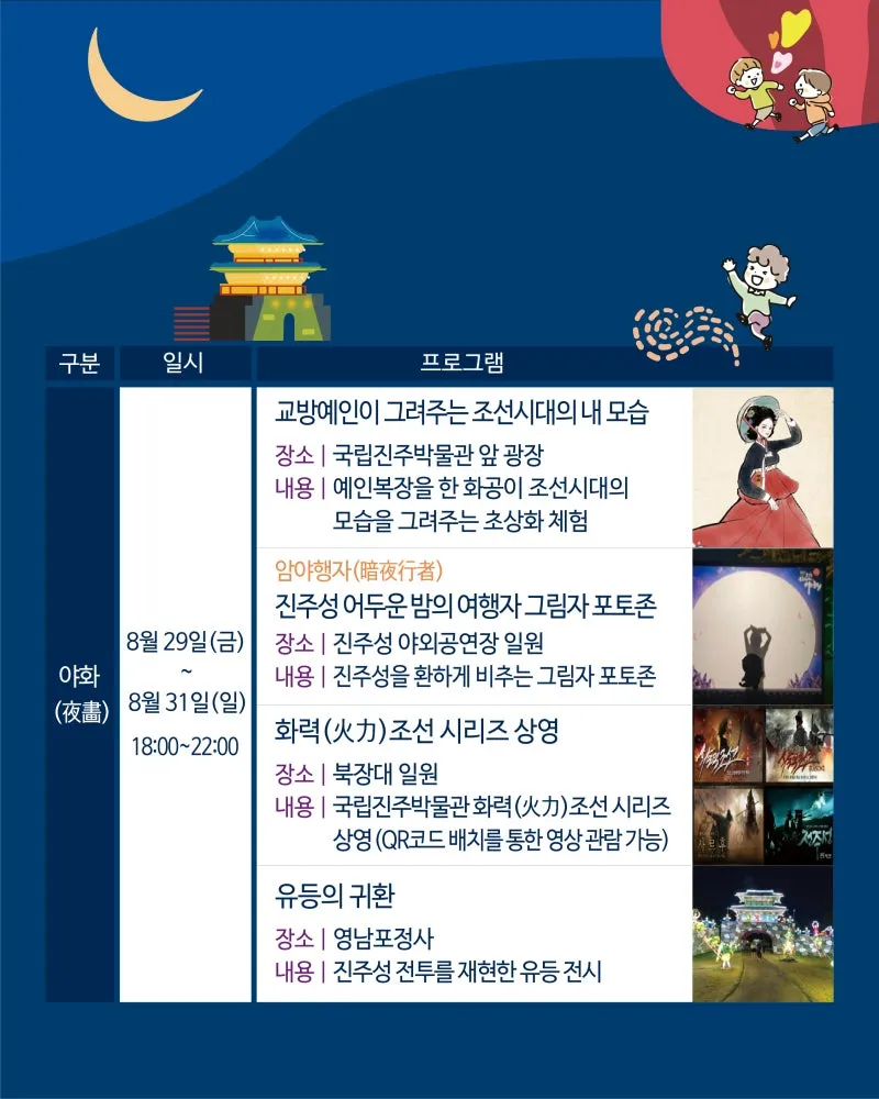 ✨야화(夜畵) – 밤을 수놓는 예술 ✅일시: 8. 29.(금) ~ 8. 31.(일) 18:00 ~ 22:00 ✅프로그램 ➰교방 예인이 그려주는 조선시대의 내 모습 〰️장소: 국립진주박물관 앞 광장 〰️내용: 예인복장을 입은 화공이 조선시대의 모습을 그려주는 초상화 체험 ➰암야행자(暗夜行者)-진주성 어두운 밤의 여행자 그림자 포토존 〰️장소: 진주성 야외공연장 일원 〰️내용: 진주의 역사 장면을 그림자 포토존으로 제작한 포토존 운영 ➰화력(火力)조선 시즌 상영 〰️장소: 국립진주박물관 〰️내용: 화력조선 영상 콘텐츠 상영 및 QR코드 배치를 통한 영상 관람 ➰유등의 귀한 〰️장소: 영남포정사 〰️내용: 진주대첩관련 유등 전시 |