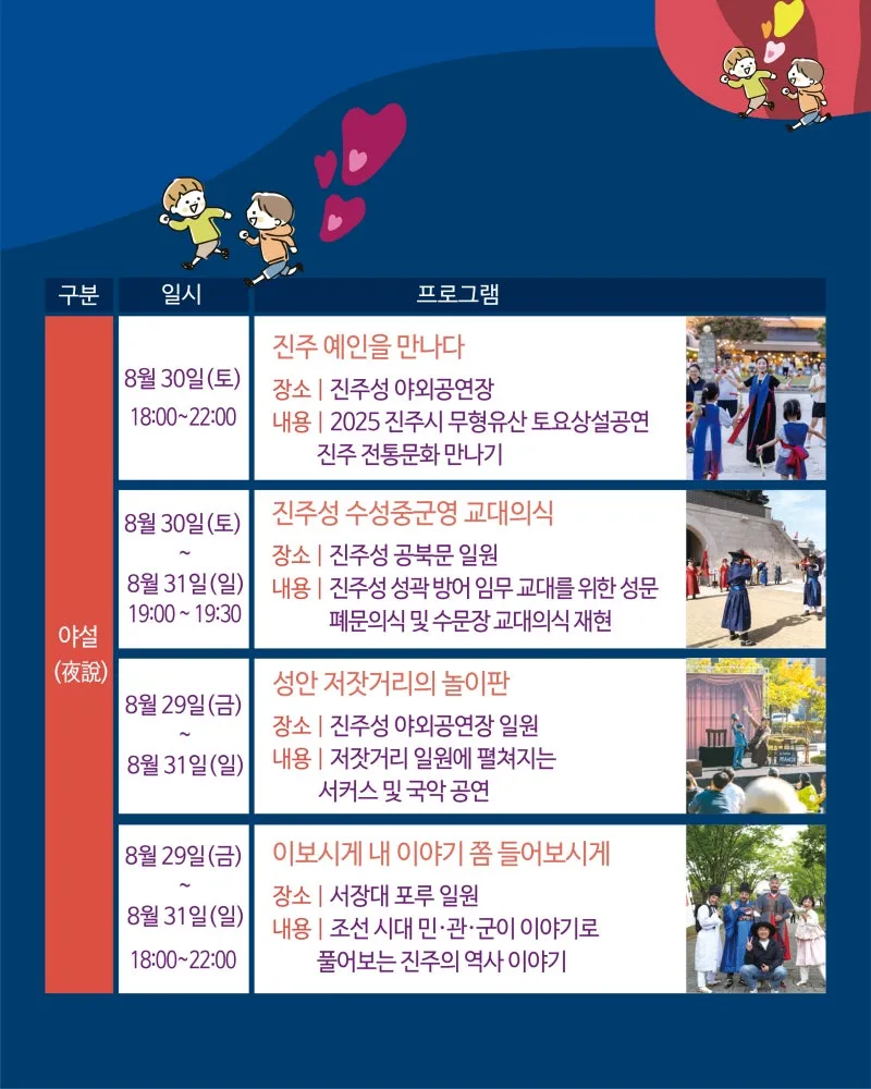 ✨야설(夜設) – 살아 숨 쉬는 무형문화유산 ✅진주 예인을 만나다 ➰일정: 8. 30.(토) 18:00 ~ 22:00 ➰장소: 진주성 야외공연장 ➰내용: 진주검무, 진주삼천포농악, 진주포구락무 등 공연 진행 ✅진주성 수성중군영 교대의식 ➰일정: 8. 30.(토) ~ 8. 31.(일) 19:00 ~ 19:30 ➰장소: 진주성 공북문 일원 ➰내용: 진주성 성곽 방어 임무 교대를 위한 성문 폐문의식 및 수문장 교대의식 재현 ✅성안 저잣거리의 놀이판 ➰일정: 8. 29.(금) ~ 8. 31.(일) 18:00 ~ 22:00 ➰장소: 진주성 야외공연장 일원 ➰내용: 성안 저잣거리 일원에 펼쳐지는 진주만의 놀이판 ✅이보시게 내 이야기를 쫌 들어보시게 ➰일정: 8. 29.(금) ~ 8. 31.(일) 18:00 ~ 22:00 ➰장소: 서장대 포루 일원 ➰내용: 민‧관‧군으로 변장한 배우들이 진주성 전투, 조선 무기 이야기를 재미나게 풀어보는 시간 |