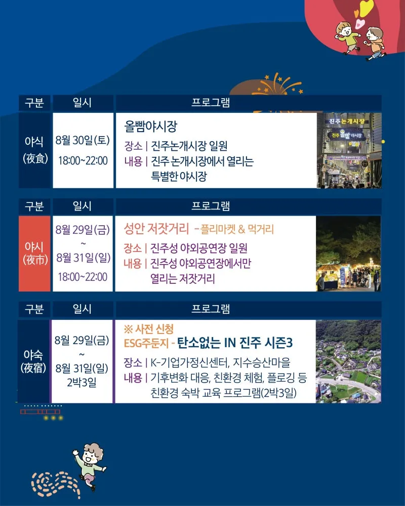 ✨야식(夜食)·야시(夜市)·야숙(野宿) ✅올빰야시장 ➰일정: 8. 30.(토) 18:00 ~ 22:00 ➰장소: 진주 논개시장 일원 ➰내용: 진주 논개시장에서 열리는 특별한 야시장 ✅성안 저잣거리 - 플리마켓 ➰일정: 8. 29.(금) ~ 8. 31.(일) 18:00 ~ 22:00 ➰장소: 진주성 야외공연장 일원 ➰내용: 진주성 야외공연장에서만 열리는 저잣거리 ✅탄소 없는 IN 진주 시즌 3 ➰일정: 8. 29.(금) ~ 8. 31.(일) / 2박 3일 ➰장소: K-기업가정신센터, 지수승산마을 ➰내용: 기후변화 대응, 친환경 체험, 플로깅 등 친환경 숙박 교육 프로그램 |