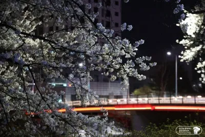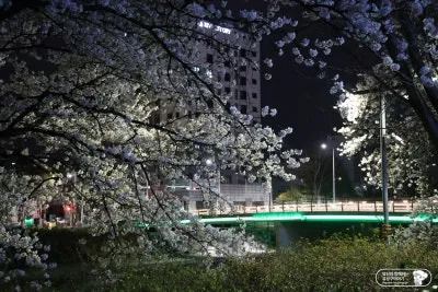 유성천 자전거길은 낮에도 화려한 벚꽃을 만나볼 수 있지만 천변을 따라 있는 가로등과 온천북교의 조명 덕분에 벚꽃 야경 명소로도 손색이 없었습니다. 녹색, 파란색, 빨간색으로 시시각각 바뀌는 다리의 조명에 따라 벚꽃의 색도 변하는 점도 좋아 보였습니다.