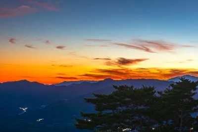 비록 운해 감상하기 위해 새벽에 올라와야 하는 번거로움, 또는 운해가 펼쳐지는 풍경을 감상하는 행운이 따르지 않더라도 천태암 앞에 180도 파노라마로 광활하게 펼쳐진 대자연의 장엄한 풍경은 그 자체로 벅찬 감동을 선사합니다. 해발 520미터 고지에 자리한 천태암의 전망은 아침, 낮, 노을 지는 저녁, 어느 때 방문하더라도 가슴을 뛰게 만들어요. 발아래로는 유장하게 흘러온 대황강(大黃江)이 아미산 품속으로 깊숙이 파고드는 듯한 그림 같은 모습을 볼 수 있습니다. 눈을 들면 화순 모후산을 중심으로 오른쪽에는 광주의 무등산, 왼쪽에는 순천의 조계산이 마치 광활한 대자연의 법당에 모셔진 삼존불처럼 서 있는 풍경은 경건함을 자아냅니다. 특히, 서산으로 해가 넘어갈 때 펼쳐지는 황홀한 저녁노을은 천태암을 찾은 여행자에게 깊은 명상의 시간을 선물합니다.