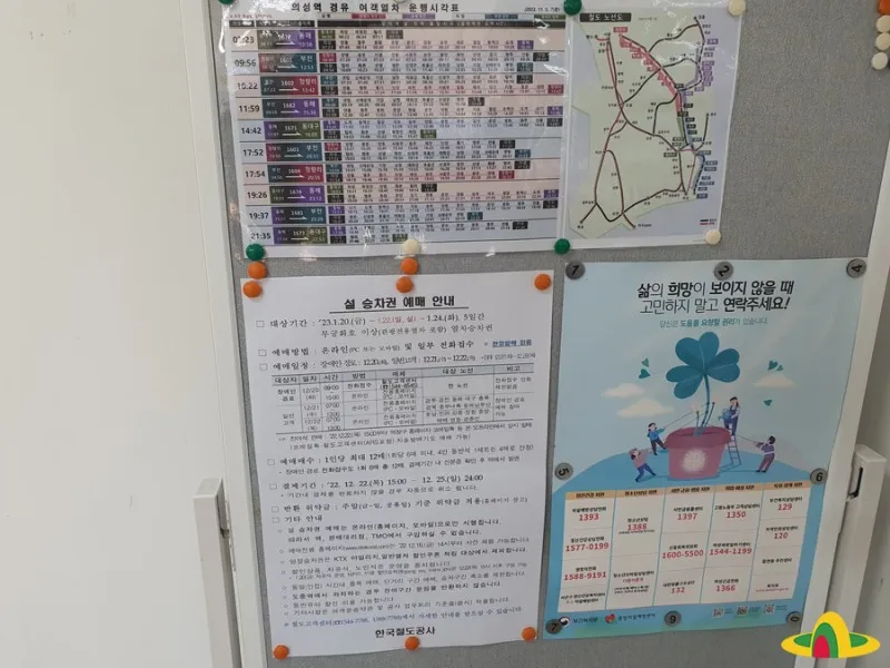 게시판에는 의성역의 경우 여객열차 운행 시간표, 철도 노선도, 설 승차권 예매 안내가 부착되어 있습니다. 설 승차권 예매는 12월 예매를 시작해 지금은 예매가 끝난 것 같네요~