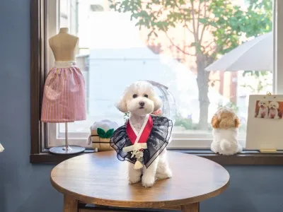내부를 둘러보니 펫 패션 매장이 아니라 고급 갤러리나 의상실 같은 느낌입니다. 광안리의 번화함 속에서 잠시 벗어나, 차분하고 고풍스러운 분위기가 느껴지는 공간에서 반려동물을 위한 특별한 옷을 고르거나 원데이 클래스에 참여하는 특별한 경험을 체험할 수 있습니다.