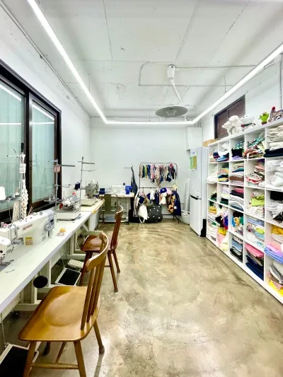 모모부띠끄 내부 한쪽에는 디자인 연구와 패턴 제작, 그리고 소잉 클래스가 이루어지는 작업 공간이 마련되어 있습니다. 재봉틀과 다양한 원단, 부자재들이 갖춰져 있어 패션 디자이너의 감각이 묻어나는 '공방' 특유의 분위기를 느낄 수 있습니다.