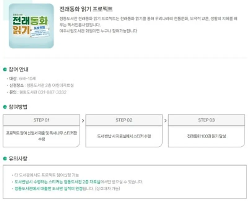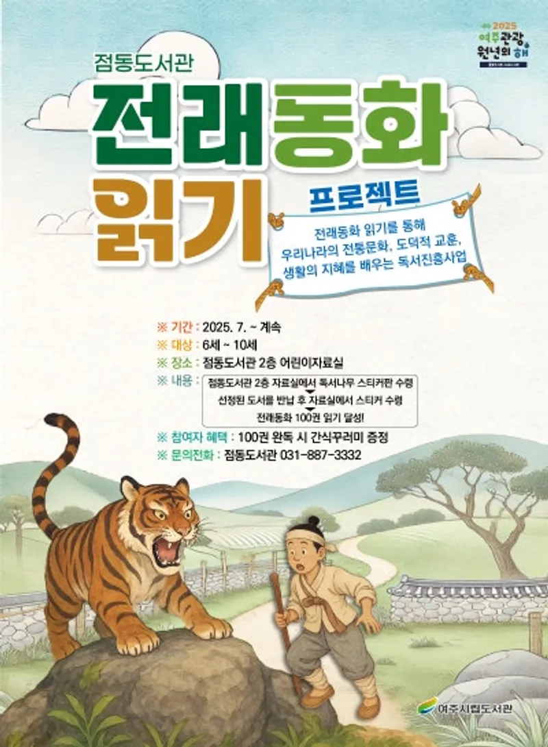 여주시 점동면 청미로에 위치한 점동도서관은 누구나 편하게 책을 읽고 문화를 즐길 수 있는 공간이다. 여름방학을 맞아 초등학생(6~10세)을 대상으로 ‘전래동화 100권 읽기’ 프로젝트를 운영 중이다.