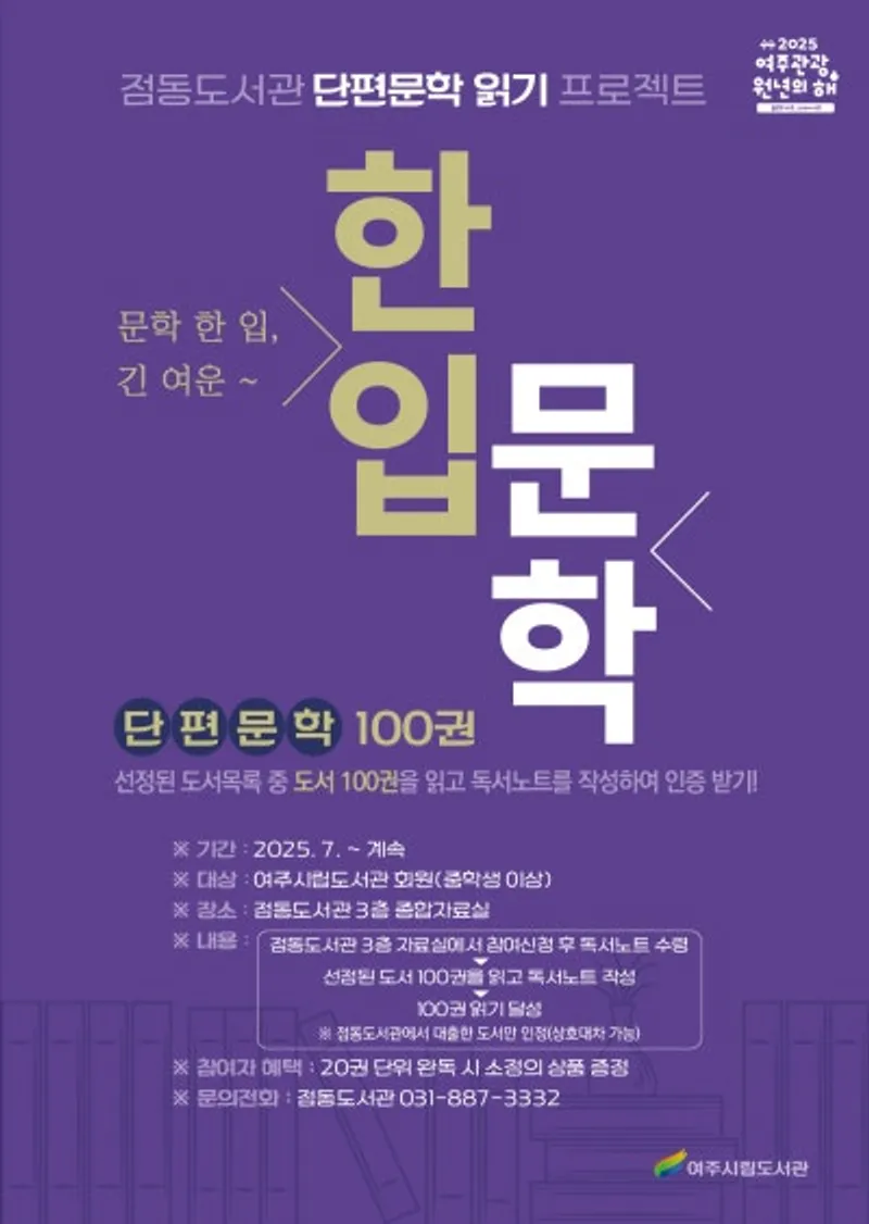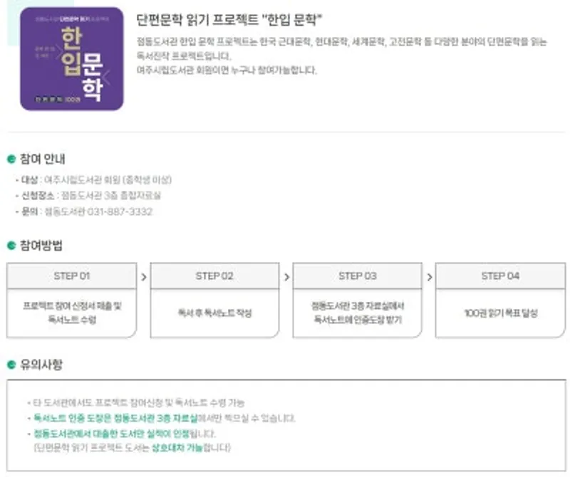 여주의 각 시립도서관에서 참여를 신청하고 독서노트를 받은 뒤, 목록에 있는 단편문학을 읽고 노트를 작성하면 된다. 이후 점동도서관 3층 자료실에서 인증 도장을 받고, 20권을 읽을 때마다 책도 읽고 원하는 책을 선물로 받는 일석이조의 즐거움을 누릴 수 있다.