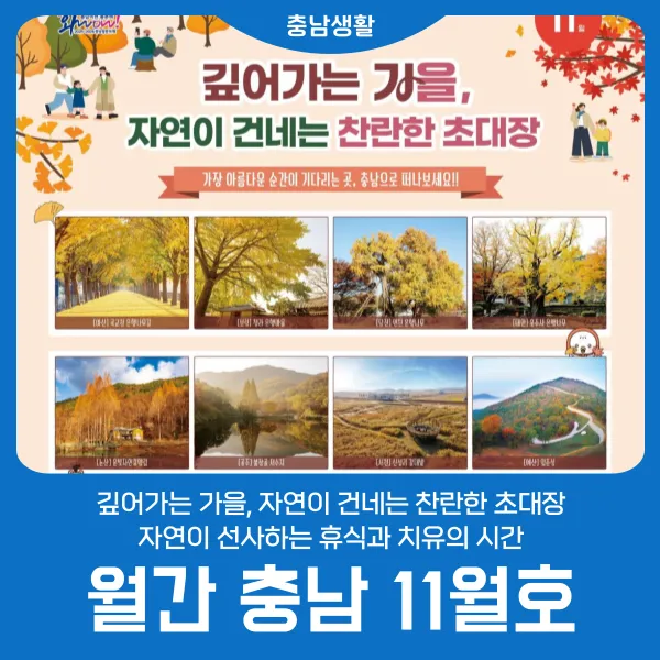 충남도가 ‘2025∼2026 충남 방문의 해’를 맞아 운영 중인 ‘월간 충남’을 통해 ‘깊어가는 가을, 자연이 건네는 찬란한 초대장’을 주제로 도내 대표 단풍 명소들을 소개한다.