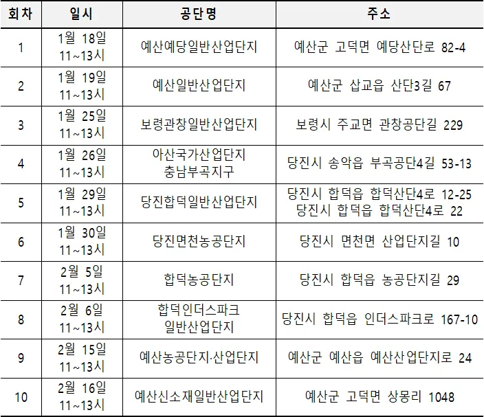 상담은 이날 예산예당일반산업단지를 시작으로, 2월 16일까지 도내 10개 산업단지에서 진행될 예정이며, 점심시간을 전후해 공단 내 노동자들이 자주 모이는 장소(식당, 편의점 등)에서 진행한다.