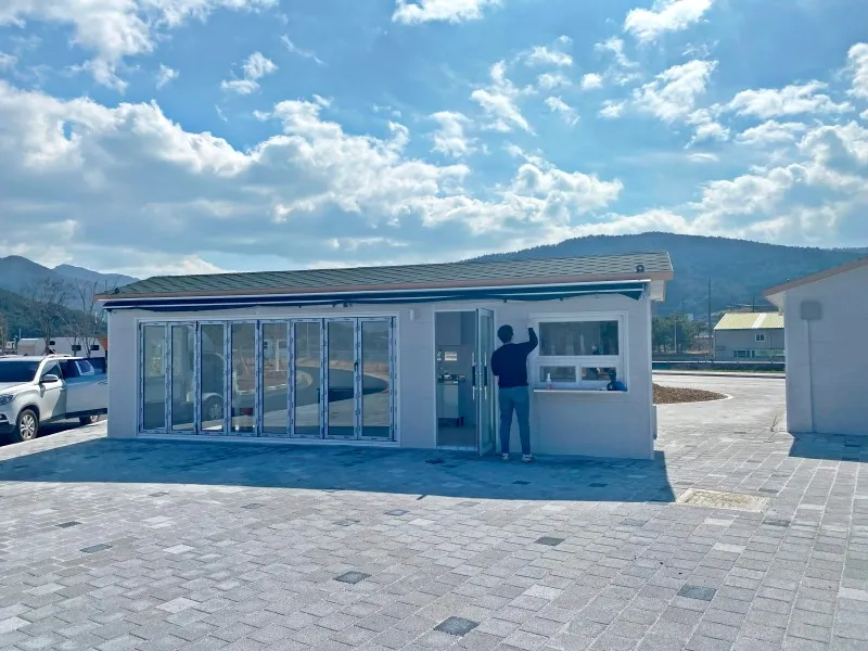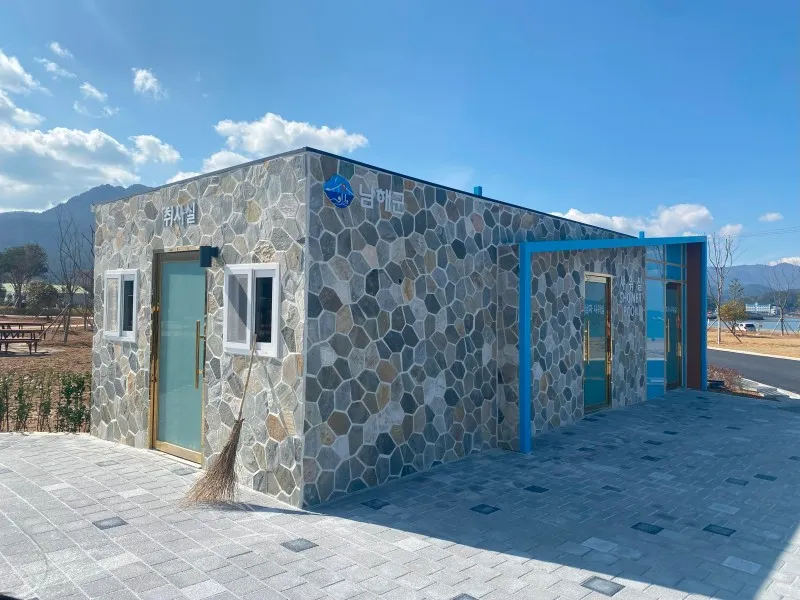 오토캠핑장 방향에 있는 샤워실과 취사실, 화장실입니다. 건물 외관이 꽤 독특하죠? 이곳의 샤워실은 바다 뷰를 바라보고 있답니다.