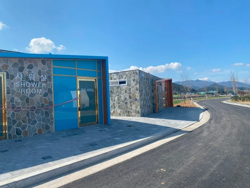 관리사무소 기준 우측 편으로는 카라반 캠핑장이 이어져 있습니다. 카라반 캠핑장 바로 앞에는 샤워실과 화장실, 취사장 건물이 있습니다. 참고로 쓰레기 분리수거장은 관리사무소 기준 우측 편에 위치해 있었습니다.