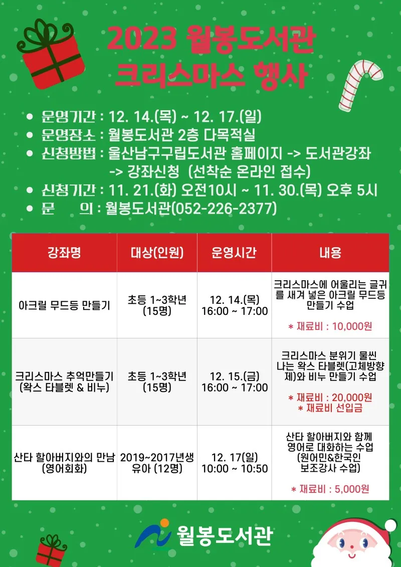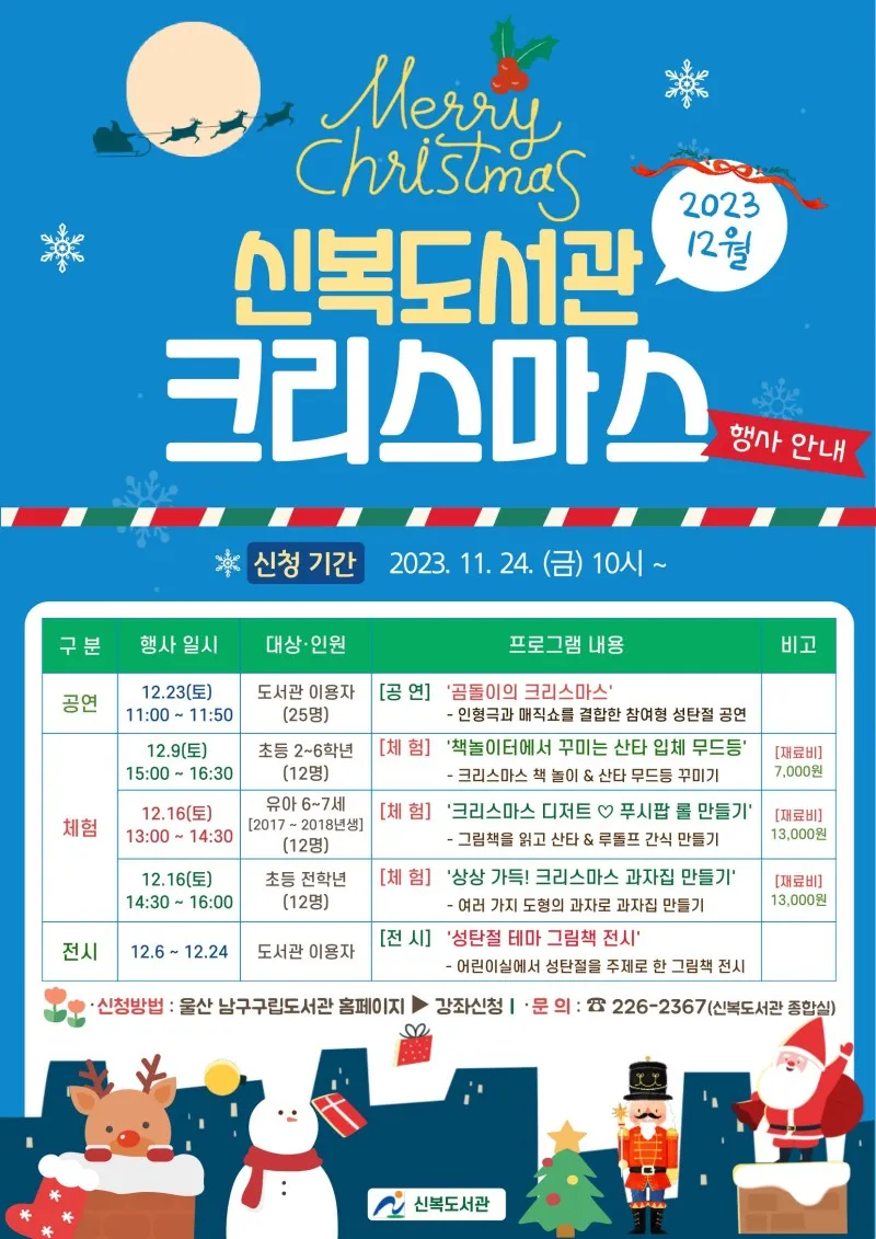 한 해를 즐겁게 마무리할 수 있는 울산 남구 구립도서관 크리스마스 행사로 즐거운 연말을 준비하시기 바랍니다! 😊