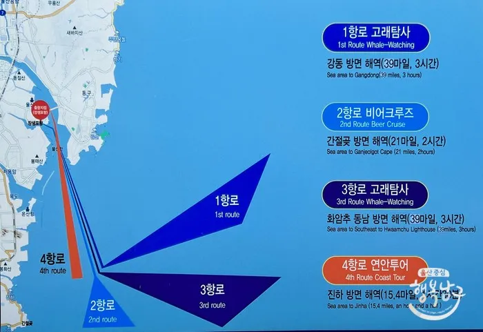 4개 코스 출항지점, 도착지점은 장생포항으로 동일합니다.