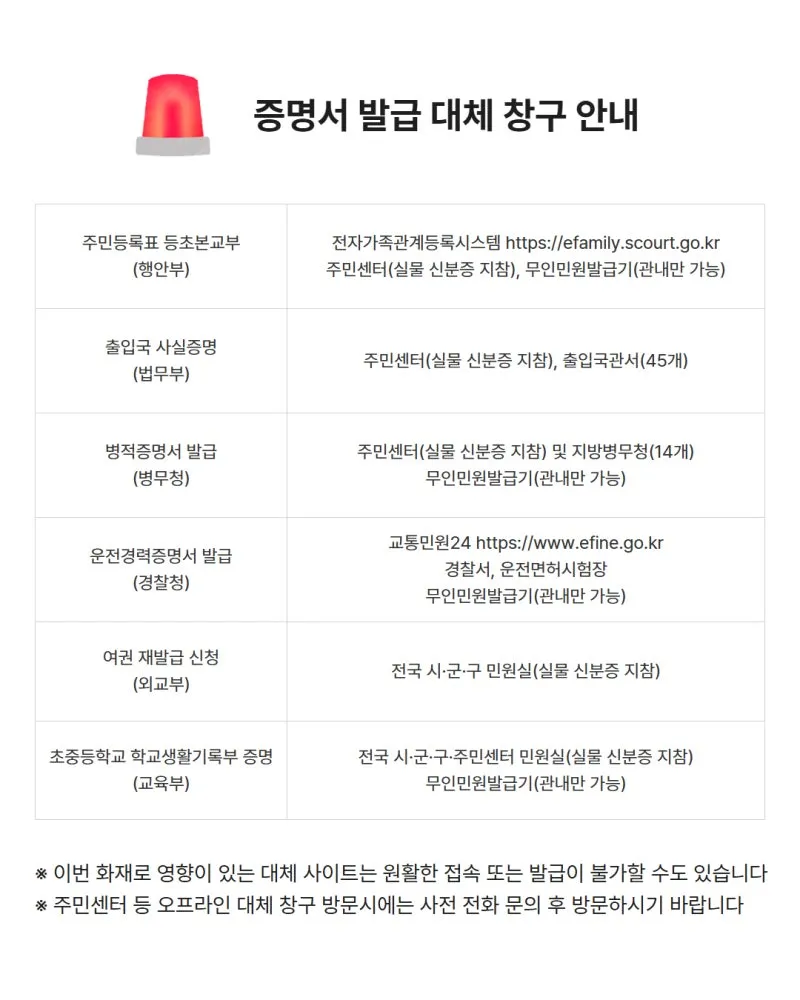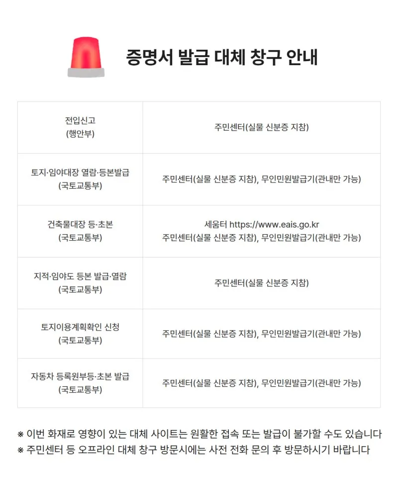 국가정보자원관리원 화재로 인한 증명서 발급 대체 창구 안내