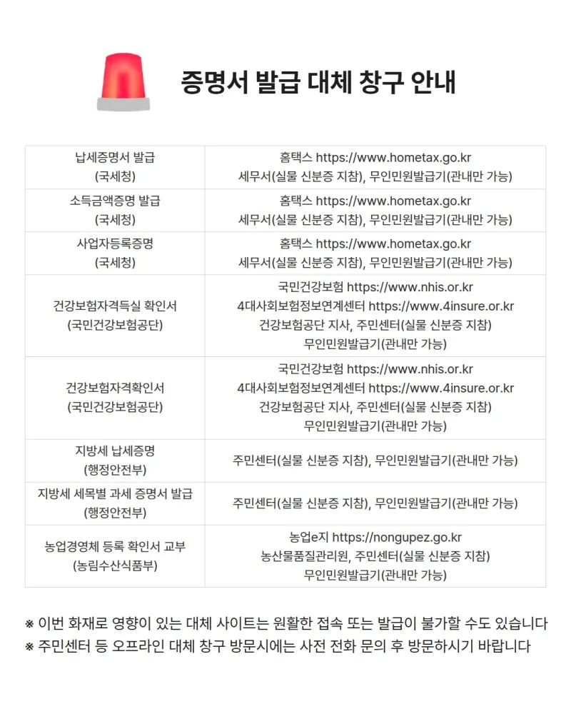 ※ 이번 화재로 영향이 있는 대체 사이트는 원활한 접속 또는 발급이 불가할 수도 있습니다.