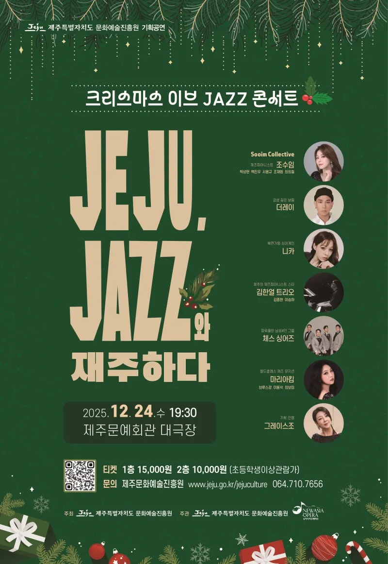 <기획공연> JEJU, JAZZ와 재주하다 예매 기간 2025.12.03. (14:00) ~ 2025.12.24. 공연 일시 2025.12.24. 19:30 장소 대극장 입장연령 초등생 이상 공연시간 (분) 100분 관람료 대극장 1층 - 15000원 / 대극장 2층 - 10000원 주최 제주특별자치도 문화예술진흥원 주관 제주특별자치도 문화예술진흥원, 뉴아시아오페라단 문의 공연문의: 064-710-7643 / 예매문의: 064-710-7656 * 1인당 5매까지 예매 가능합니다. * 20명 이상은 전화문의 주세요. * 온라인 예매는...