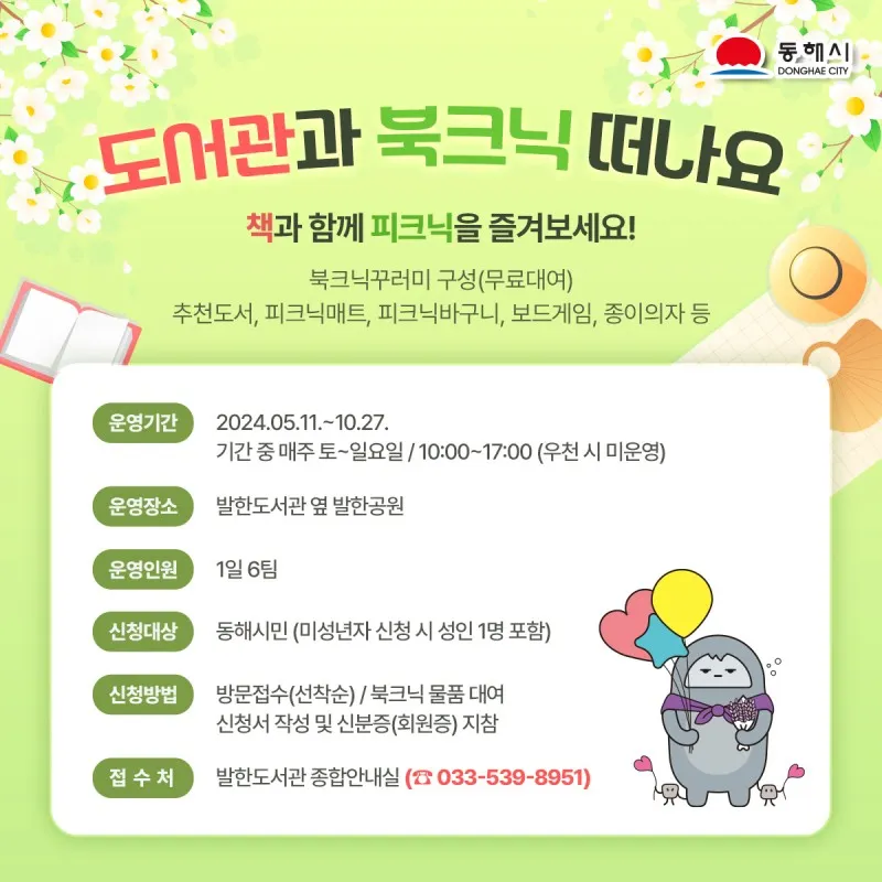 📍신청방법 : 방문접수(선착순)/북크닉 물품 대여 신청서 작성 및 신분증(회원증) 지참