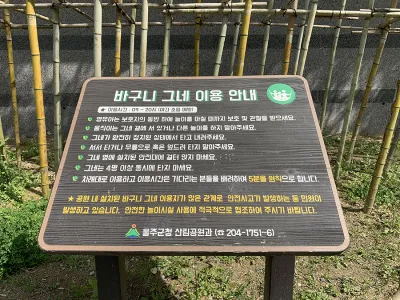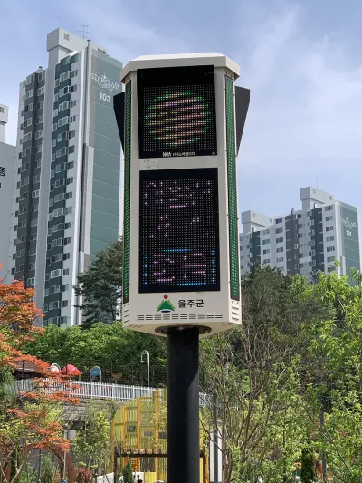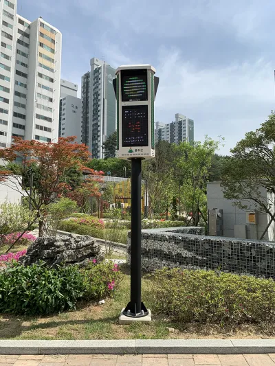 실시간 날씨, 기온, 미세먼지 상태를 확인할 수 있도록 공원 입구에서 안내 중입니다.