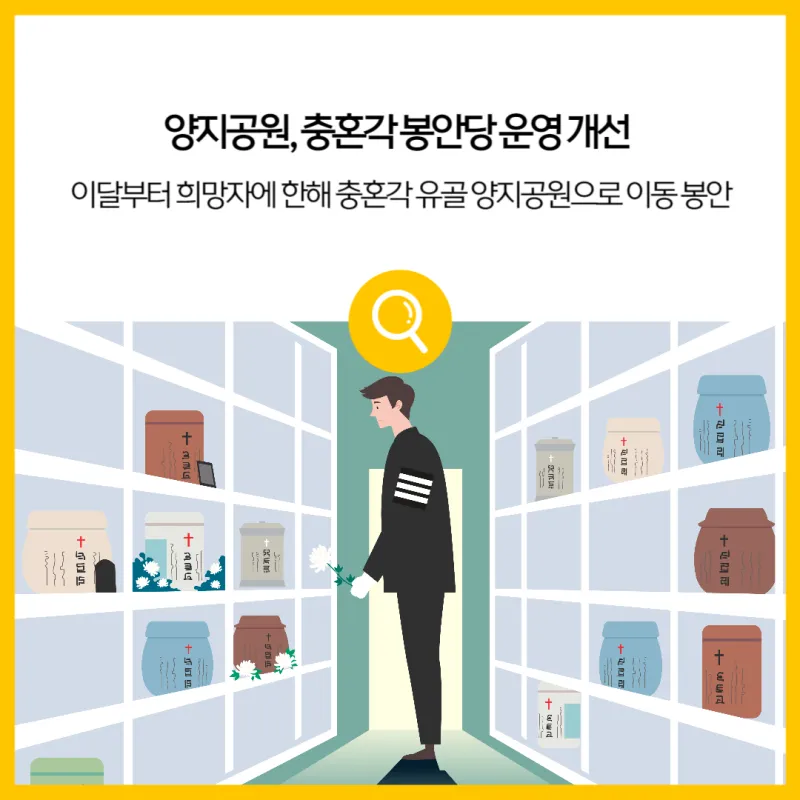당초 양지공원에서 운영하는 봉안당(4개소, 충혼각 포함) 내 유골은 위치 변경이 불가능했으며 충혼각에 있는 유골을 양지공원 내 안치단으로 옮기고 싶어도 한 개의 시설로 보아 이동이 제한됐지만 충혼각 봉안당을 양지공원 봉안당과 별도의 시설로 보는 이번 조치 완화로 서로 간에 자유롭게 이동이 가능하도록 했습니다.