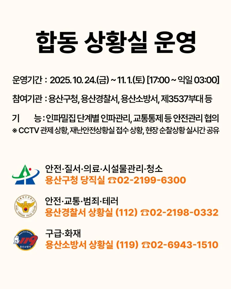 🔈용산구청 안전·질서·의료·시설물관리·청소 용산구청 당직실 ☎02-2199-6300 🔈용산경찰서 안전·교통·범죄·테러 용산경찰서 상황실 (112) ☎02-2198-0332 🔈용산소방서 구급·화재 용산소방서 상황실 (119) ☎02-6943-1510 ※ 현장상황에 따라 근무인원, 운영시간 등 탄력적 운영 |