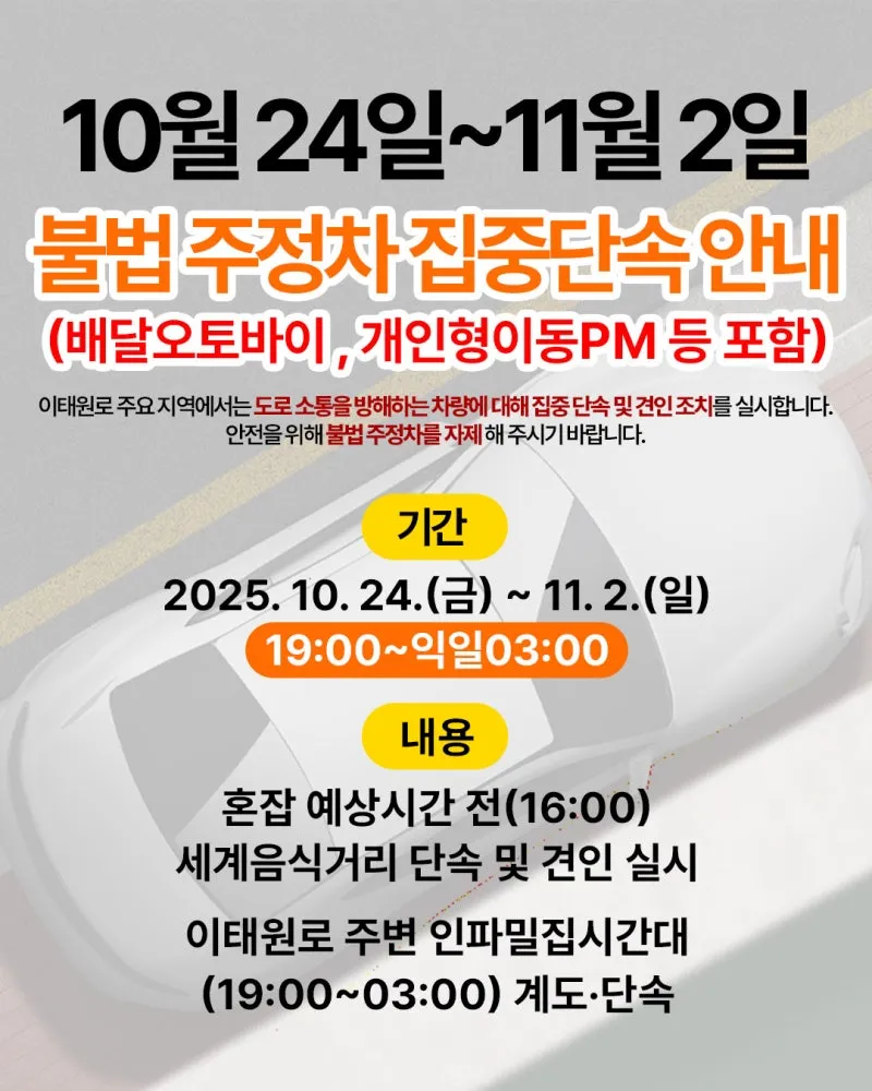 🔸혼잡 예상시간 전(16:00) : 세계음식문화거리 단속 및 견인실시