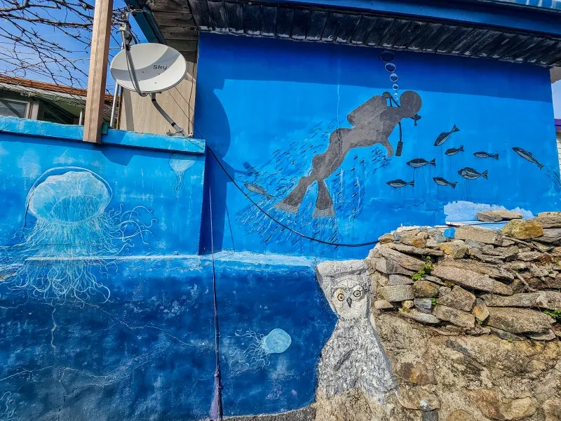 조금 더 올라가면 해파리와 스킨스쿠버 하는 사람이 그려진 벽화가 보이는데 마치 깊은 바다에 들어온 듯한 느낌이 들어요. 그런데 이 벽화에는 숨은그림찾기라도 하듯 부엉이가 숨겨져(?)있어요. 시선강탈하는 부엉이. 약간 쌩뚱맞기는 한데 또 너무 감쪽같아서 한참을 들여다봤어요.