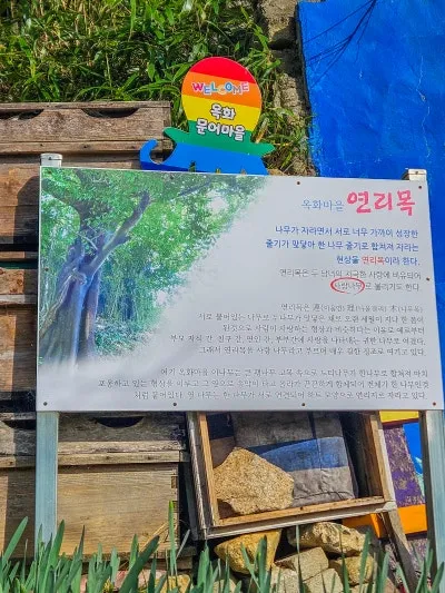 문어를 낚시해 가는 가족의 벽화 옆에는 옥화마을 연리목을 볼 수 있어요. 나무가 자라면서 서로 너무 가까이 성장한 줄기가 맞닿아 한 나무줄기로 합쳐져 자라는 현상을 연리목이라 하는데 두 남녀의 지극한 사랑에 비유되어 사랑의 나무라고도 불린대요.