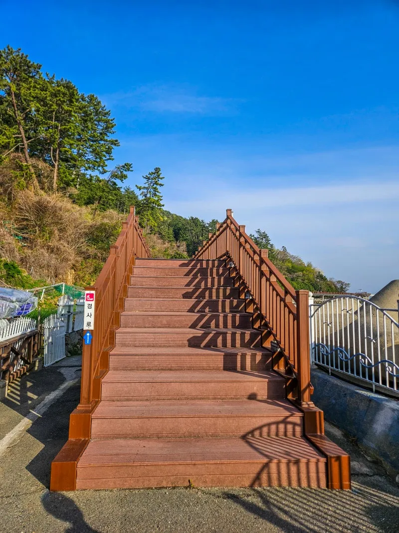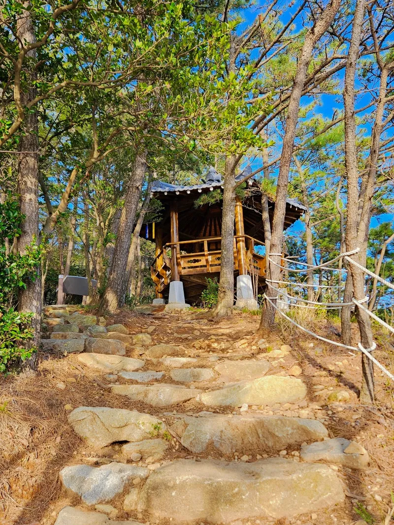 무지개바다윗길 끝까지 오면 산으로 이어지는 계단이 있고 계단 바로 앞에 정자가 있어요. 이곳에서는 멀지만 지심도도 보여요.