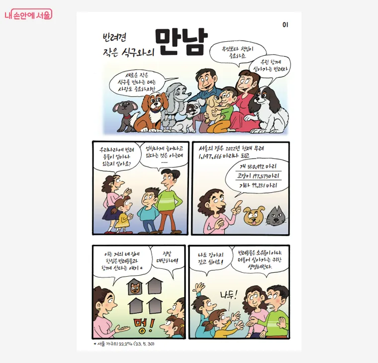서울시는 2018년부터 ‘서울 반려동물 시민학교’를 운영하며 반려동물과 보호자의 원활한 소통과 공존을 위한 교육 프로그램을 진행해왔다. 이번 교육 책자는 다소 어려웠던 기존 자료와 달리 익숙한 만화로 제작돼 어린이부터 성인까지 쉽고 재미있게 반려견을 돌보는 방법을 배울 수 있다.