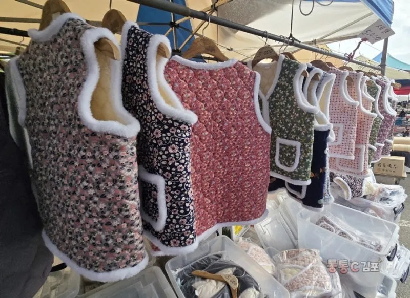 전통 시장에서나 볼 수 있는 풍경들이에요. 따뜻해 보이는 어머님들 입으시는 두툼한 털 조끼 어쩜 꽃무늬가 저리도 고운지 너무 예쁘더라고요.