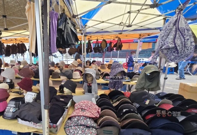 이 사진은 왼쪽에 서 계신 분이 찍힐까 봐 옆으로 비껴서 찍은 사진으로 반절 정도만 찍은 건데도 모자 종류도 어찌나 많은지! 등산 모자, 물놀이 피서 모자, 농사지을 실 때 쓰시는 챙이 아주 넓은 모자 등등 정말 종류가 어마어마 다양하게 많았어요.