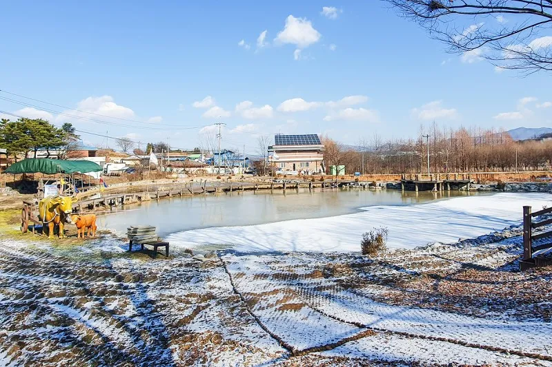 눈썰매장과 비닐하우스 사이에 연못이 있는데 날씨가 어찌나 좋던지 이런 풍경조차도 예뻐 보입니다.