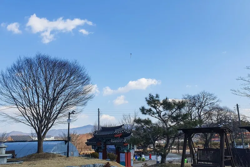두레관 앞에는 넓은 잔디마당이 있는데 이곳에서 연날리기도 할 수 있어요.